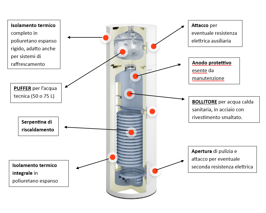 È importante sottolineare che il puffer contiene acqua “sporca”, ovvero acqua tecnica non destinata al consumo sanitario, ma solo alla circolazione nell’impianto.